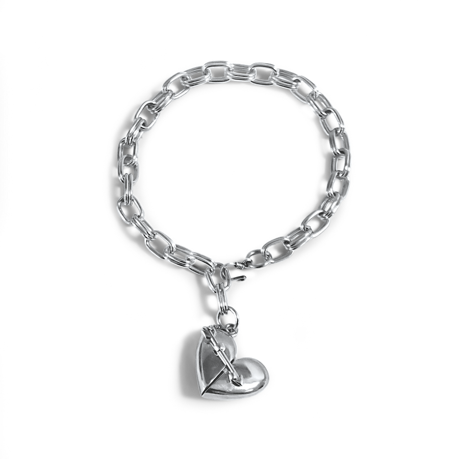 The Heart + Arrow Bracelet opens and closes to reveal a secret fortune scroll.